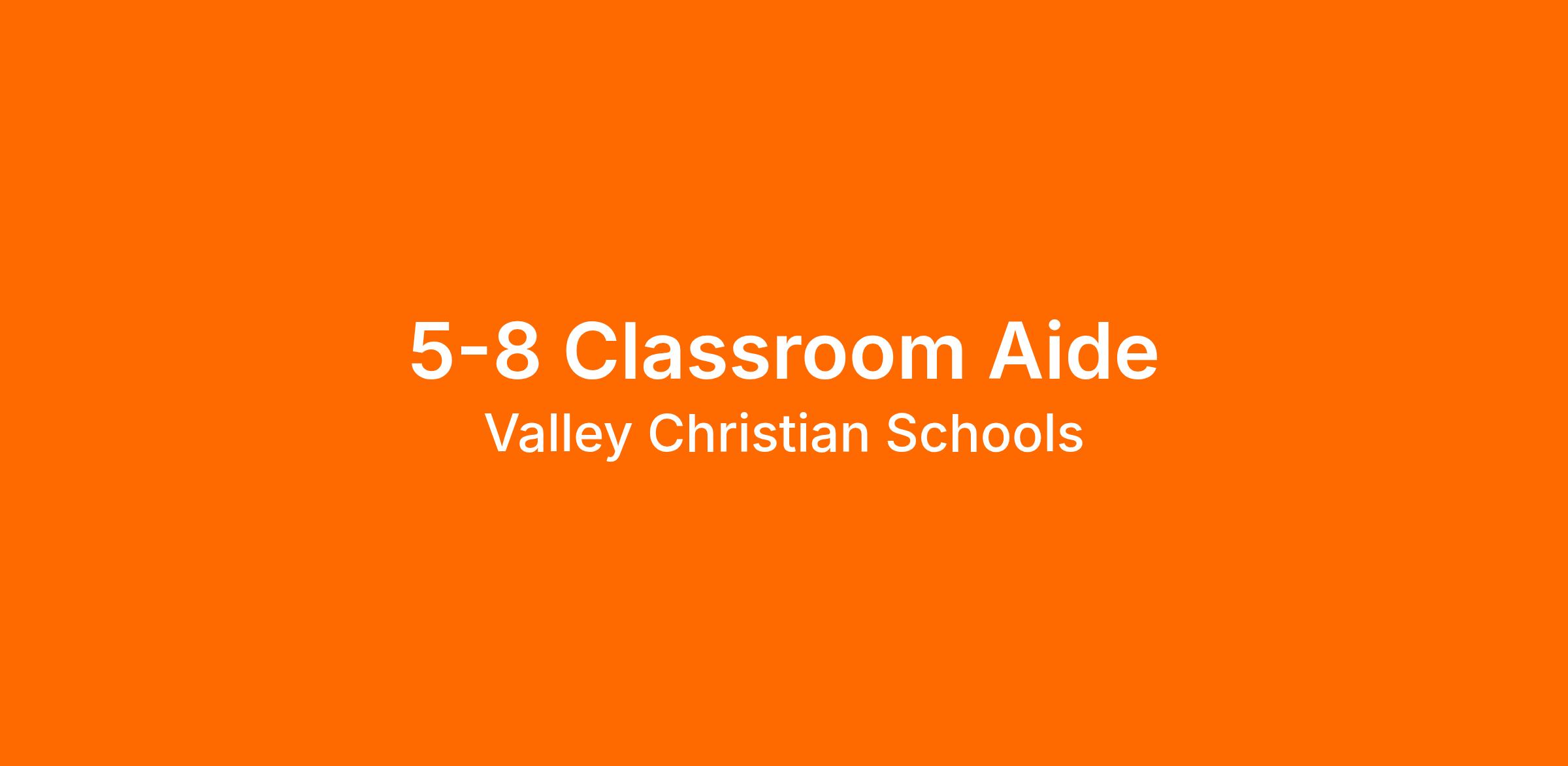 This part-time position is responsible for Classroom Aide orientated tasks (instructional support, small groups, activity and AM/PM duty) for our 5th-8th grade classrooms. The 5-8 Classroom Aide is one who displays a deep knowledge of Scripture and how it applies to the lives of students. This includes an ability to demonstrate a passion for ministering to students. The 5-8 Classroom Aide must be a professing and maturing Christian enthusiastically supporting Valley Christian's Statement of Faith and mission statements.