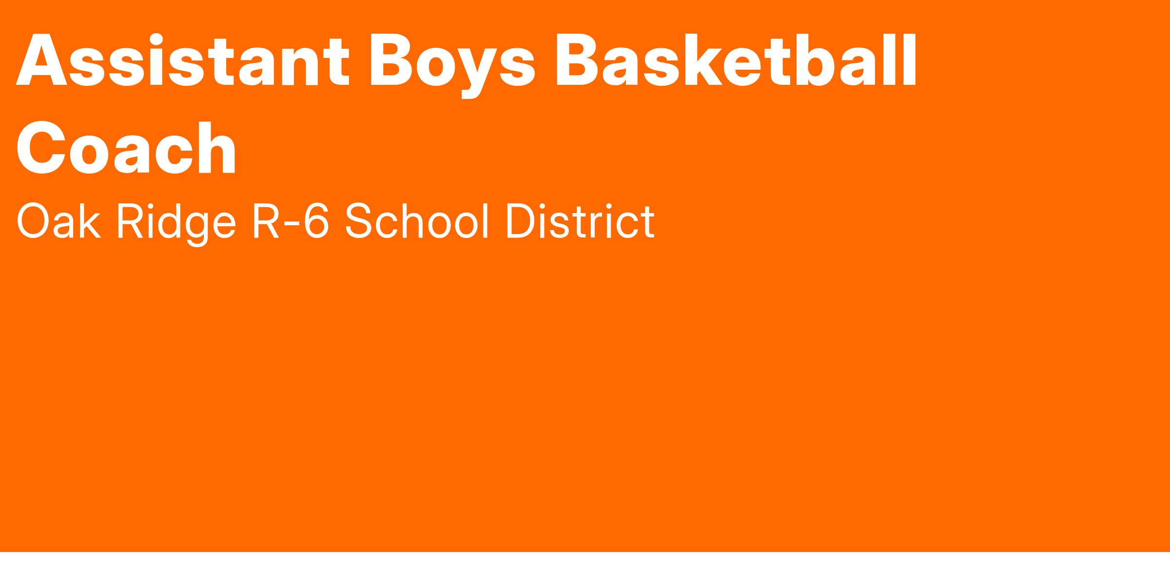 The Oak Ridge R-6 School District is accepting applicants for an Assistant Boy's Basketball Coach for the 2025-2026 school year. Applications can be found on the district website. If you are interested and have any questions, please contact High School Principal Mr. Clayton Collier or ccollier@oakridge.k12.mo.us. Position open until filled. The Oak Ridge R-6 School District is an equal opportunity employer.