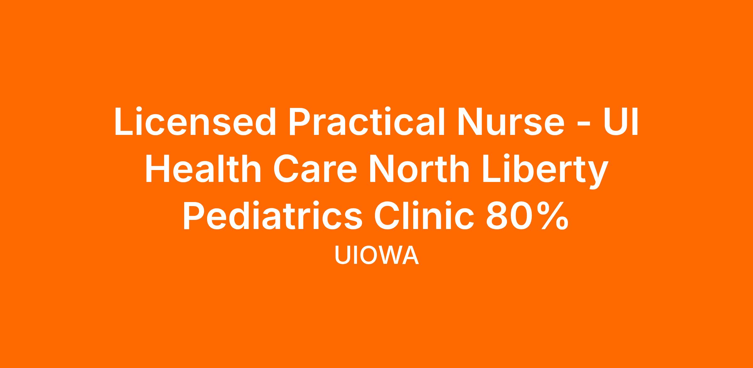 The University of Iowa Community Clinics (UICC) is seeking a patient centered 80% (32 hours a week) Licensed Practical Nurse (LPN) to work at our UICC North Liberty Pediatrics Clinic. This position will mainly support our Pediatrics Clinics but could float to other patient specialties/clinic locations including but not limited to: Pediatrics, Family Medicine, and/or Specialty/Outreach Clinics.