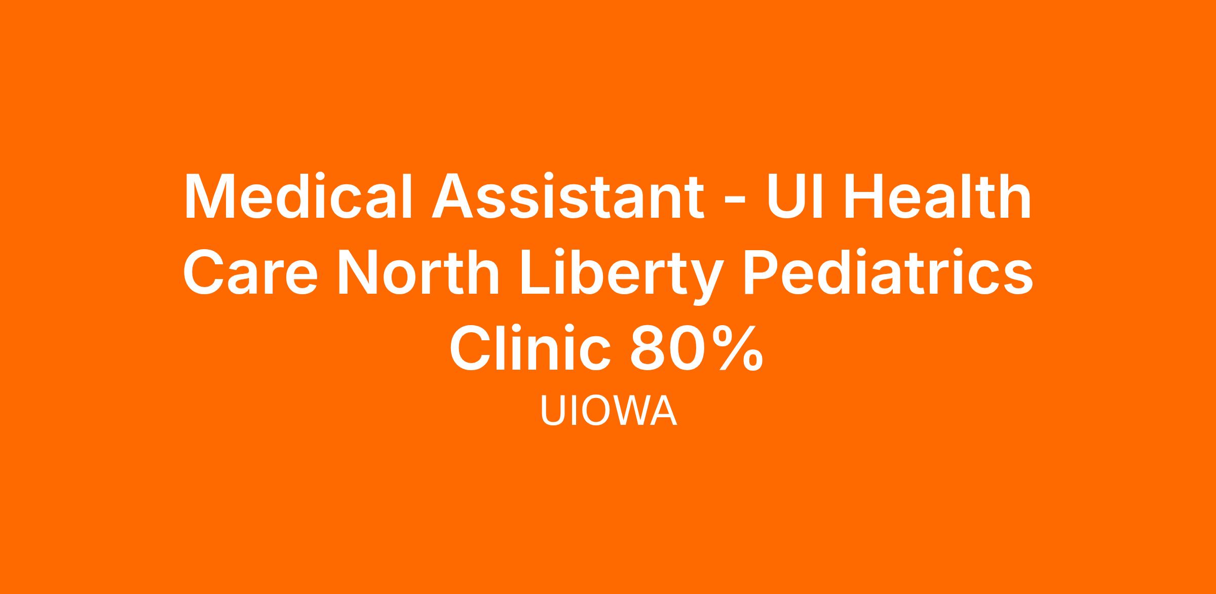 The University of Iowa Community Clinics is seeking a patient centered 80% (32 hours a week) Medical Assistant II (MA II) to work at our UICC North Liberty Pediatrics Clinic. This position will mainly support our Pediatrics Clinics but could float to other patient specialties/clinic locations including but not limited to: Pediatrics, Family Medicine, and/or Specialty/Outreach Clinics.