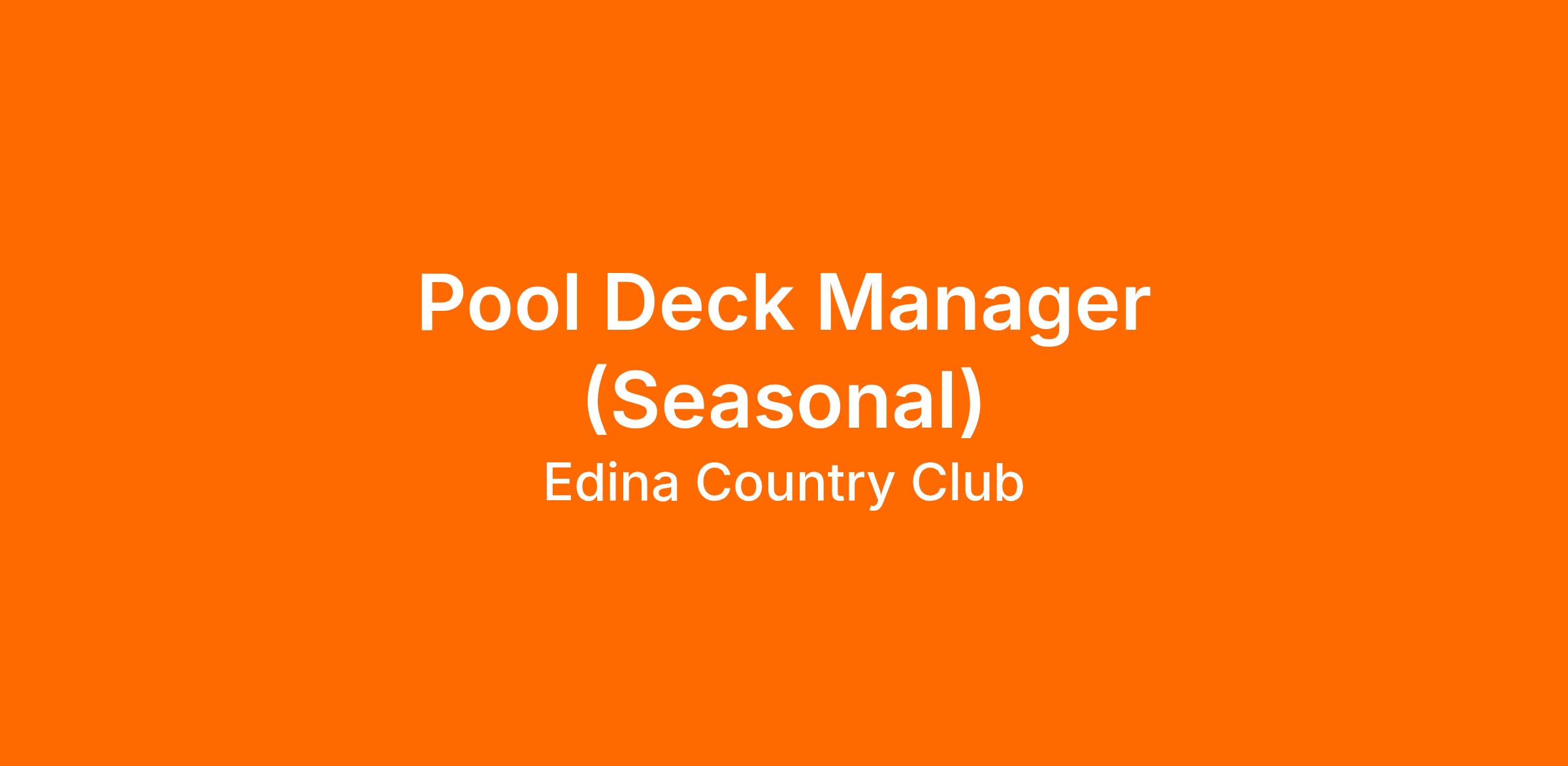 The Deck Manager is responsible for always ensuring the safety of swimmers and members in the pool and surrounding pool area. The Deck Manager oversee the activities, maintenance, and daily pool operation of the ECC Pool in the absence of the Pool Director. Deck Managers participate in pool activities and ensure that members and guests are following pool procedures. They strive to create a welcoming, safe recreation area for members, guests, and staff. Deck Managers are responsible for assisting Pool Director in all facets of developing, managing, promoting, and coordinating comprehensive pool activities for members and guests of the Club.