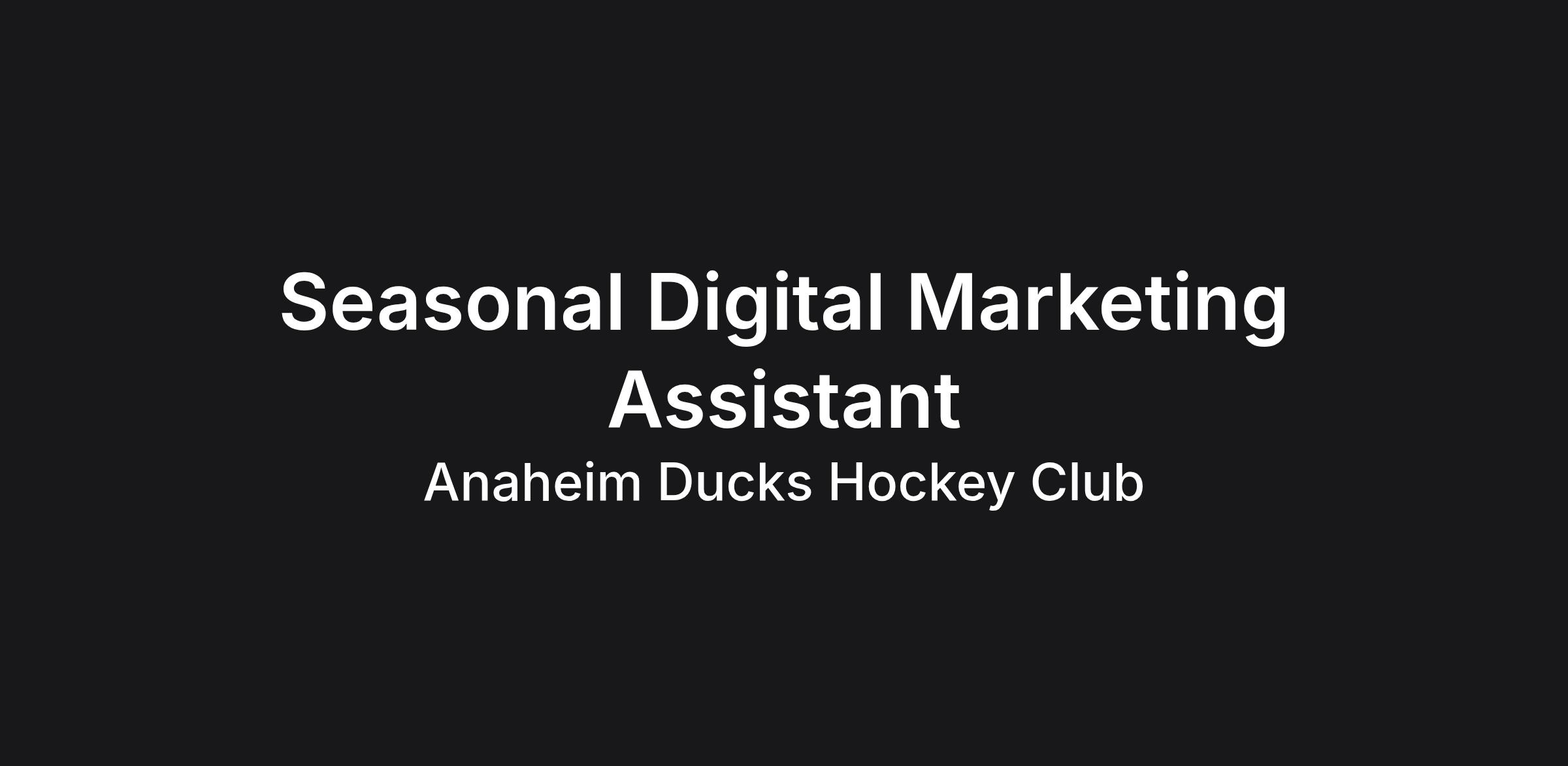 The starting hourly rate for this position is $25.00 per hour.The Digital Marketing Assistant is a full-time, seasonal position within the Marketing Department of the Anaheim Ducks and focuses on assisting the needs of the digital marketing team. This role reports to the Director of Digital Marketing & Analytics and assists with the day-to-day execution and evaluation of various digital marketing campaigns.