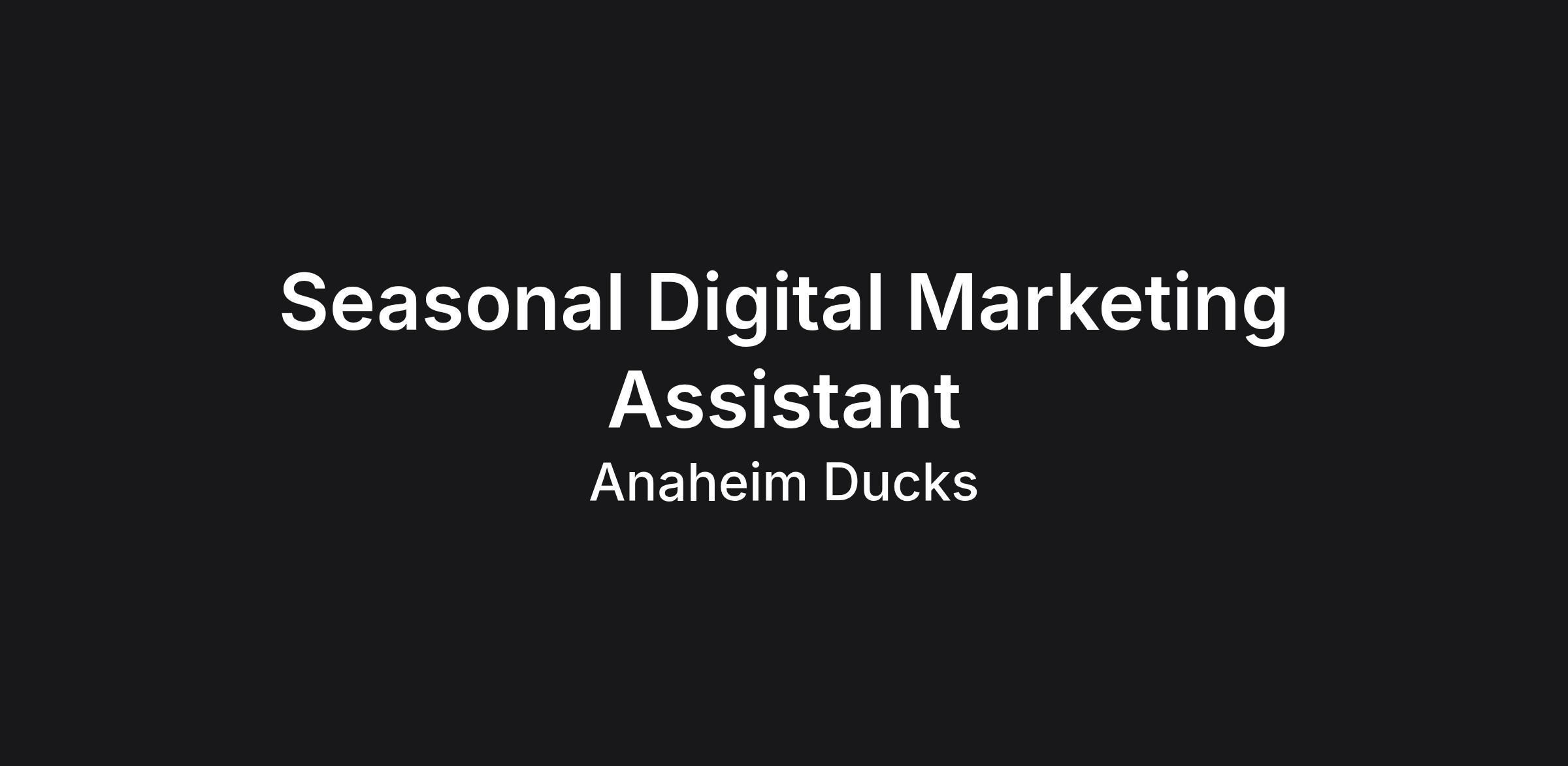 The Digital Marketing Assistant is a full-time, seasonal position within the Marketing Department of the Anaheim Ducks and focuses on assisting the needs of the digital marketing team. This role reports to the Director of Digital Marketing & Analytics and assists with the day-to-day execution and evaluation of various digital marketing campaigns.