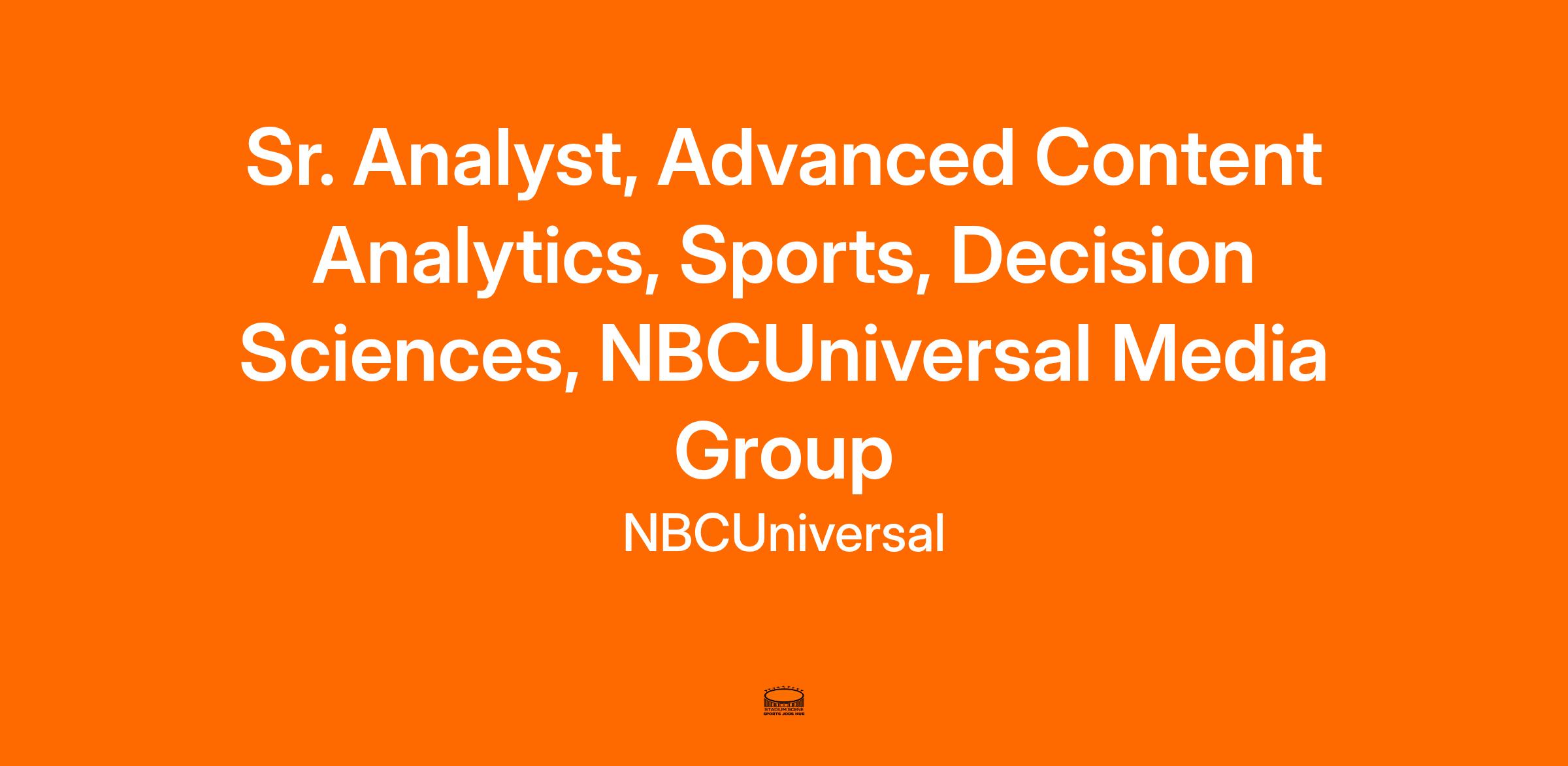 This position will be on the Content Evaluation & Advanced Analytics team working closely with the Sports Decision Sciences team with a charter to generate impactful content performance insights to enhance content investment, programming, and other strategic business decisions. As Senior Analyst, you will work in a high-visibility and fast-paced environment, delivering insights and analyses that support the evaluation and acquisition of content for NBCUniversal (especially Peacock). This role will have a tangible impact on Peacock’s growth and success as it establishes itself as a major player in the streaming landscape. The role consists of developing insights across the NBC Sports portfolio, including the Olympics, NFL, NBA, PGA TOUR, Big Ten, Notre Dame, FIFA World Cup, WWE, and Premier League.