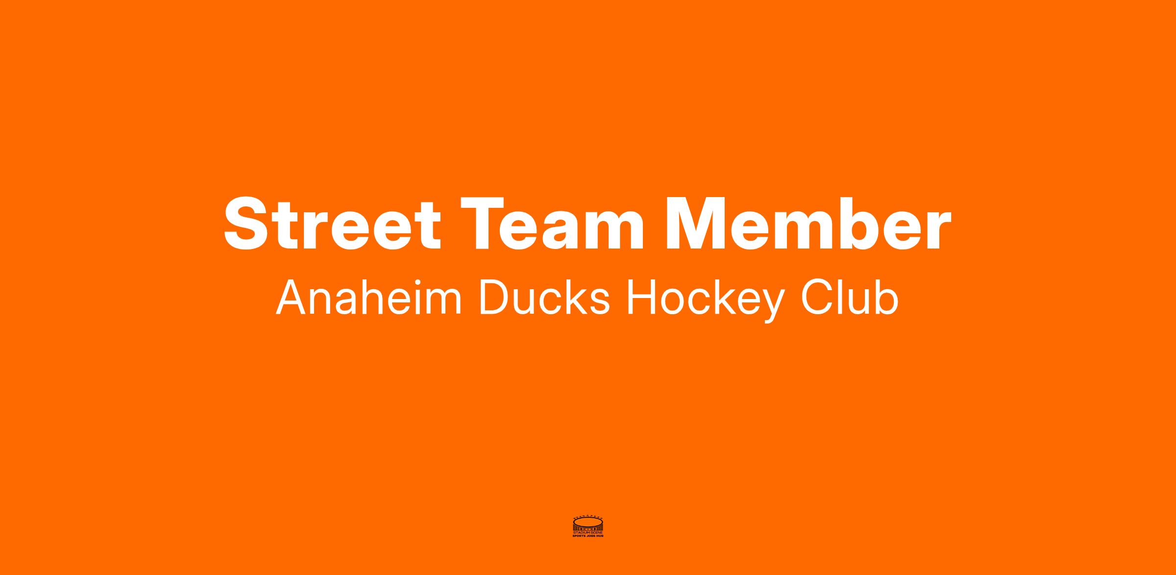 The starting hourly rate for this position is $19.00 per hour.This is a part-time position within the Anaheim Ducks Marketing Department. The Street Team is an energetic group of brand ambassadors who are passionate about and committed to promoting the Anaheim Ducks Hockey Club. Their primary responsibility is to represent the Anaheim Ducks brand at home games and a variety of community events.